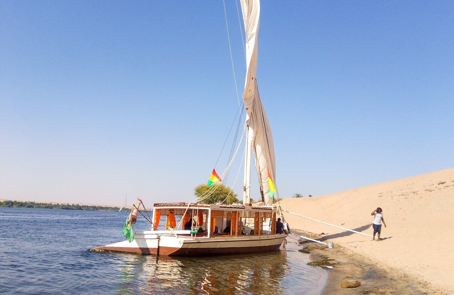 Commencez votre expérience par une prise en charge à votre hôtel, suivie d’un court trajet jusqu’à la rive du fleuve où votre felouque traditionnelle vous attend. Montez à bord de ce charmant bateau en bois, détendez-vous sur des coussins confortables et laissez-vous guider par la brise légère pendant que vous naviguez sur le Nil.